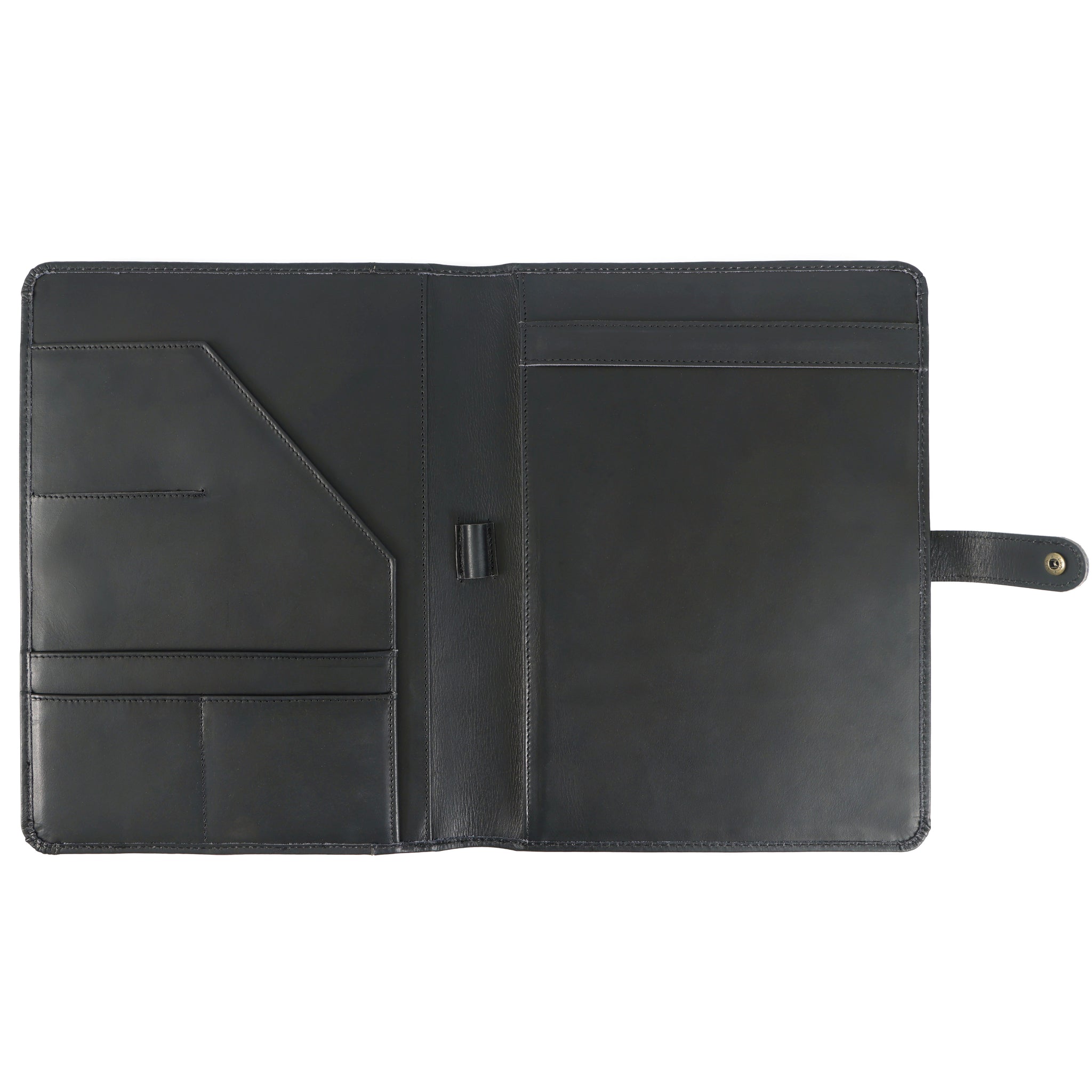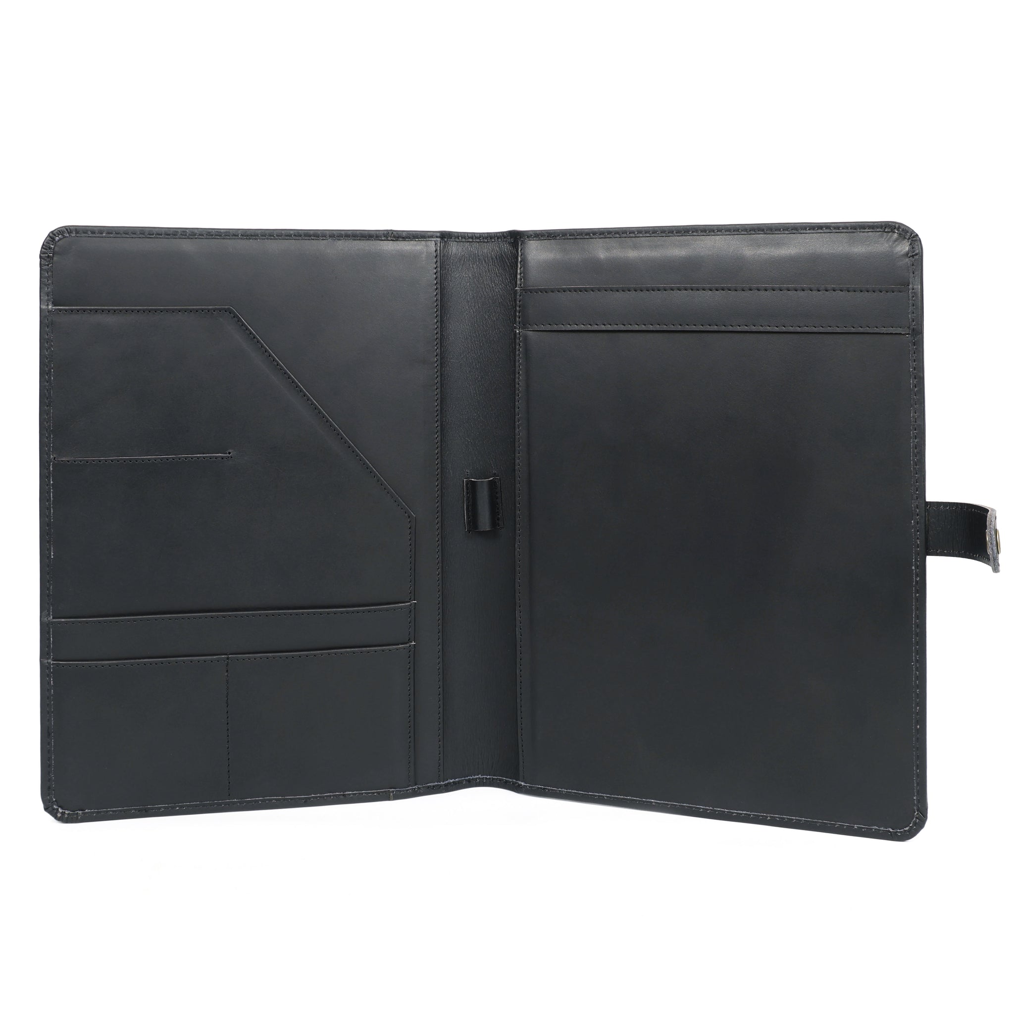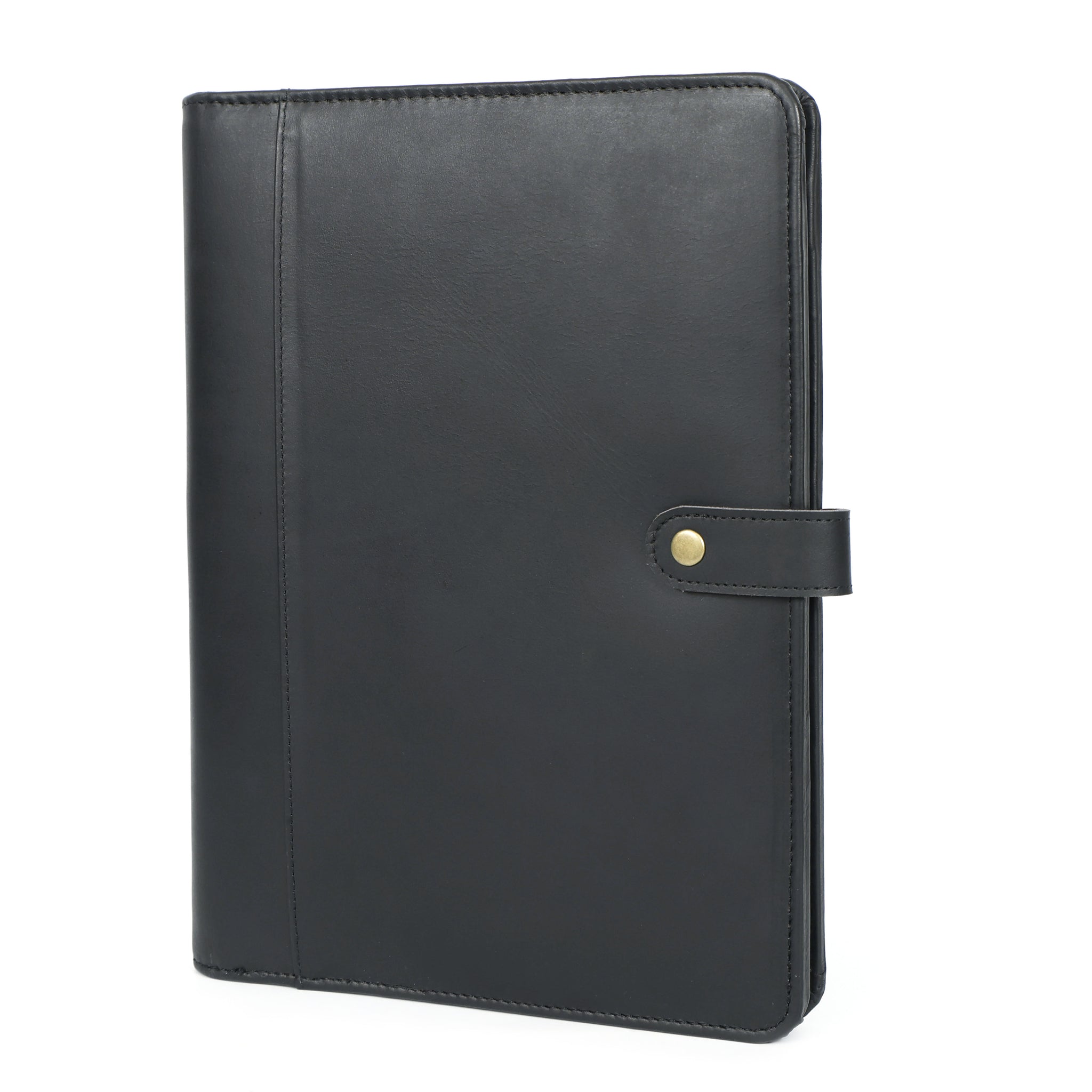Skillfully crafted from premium full grain black leather, our snap portfolio padfolio offers enduring durability combined with refined style. Designed for professionals who value both function and elegance, this padfolio ensures you make a bold, confident impression wherever your day takes you.