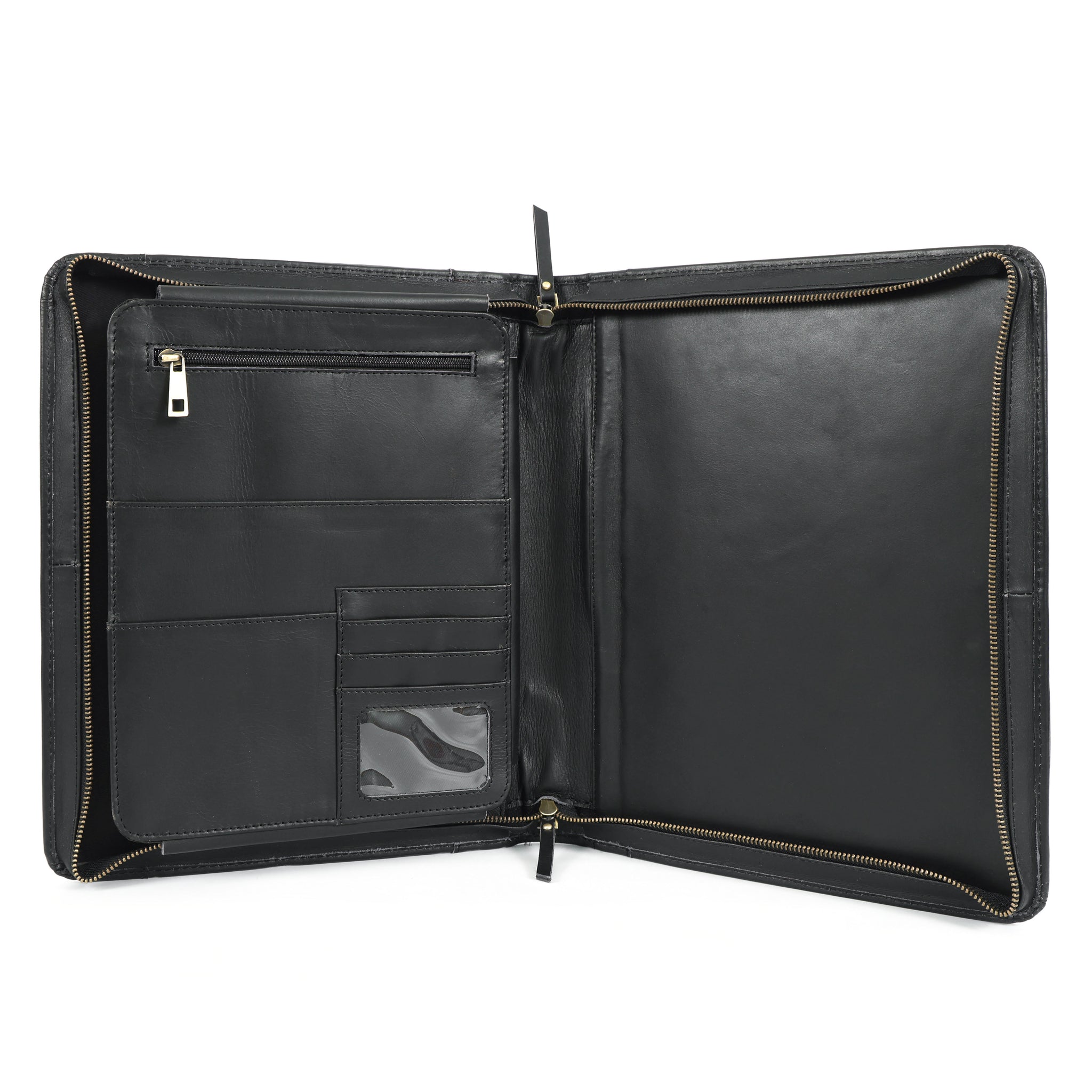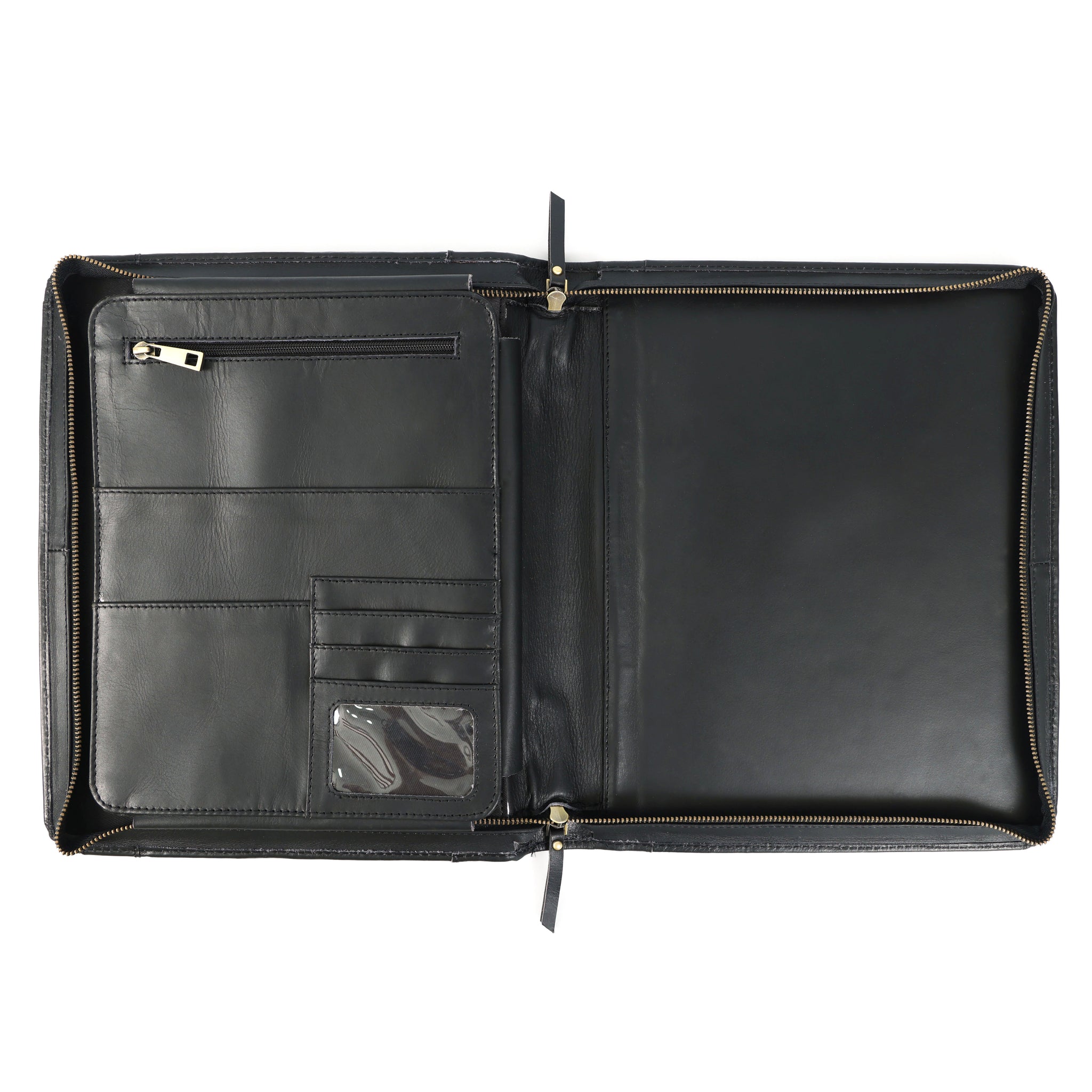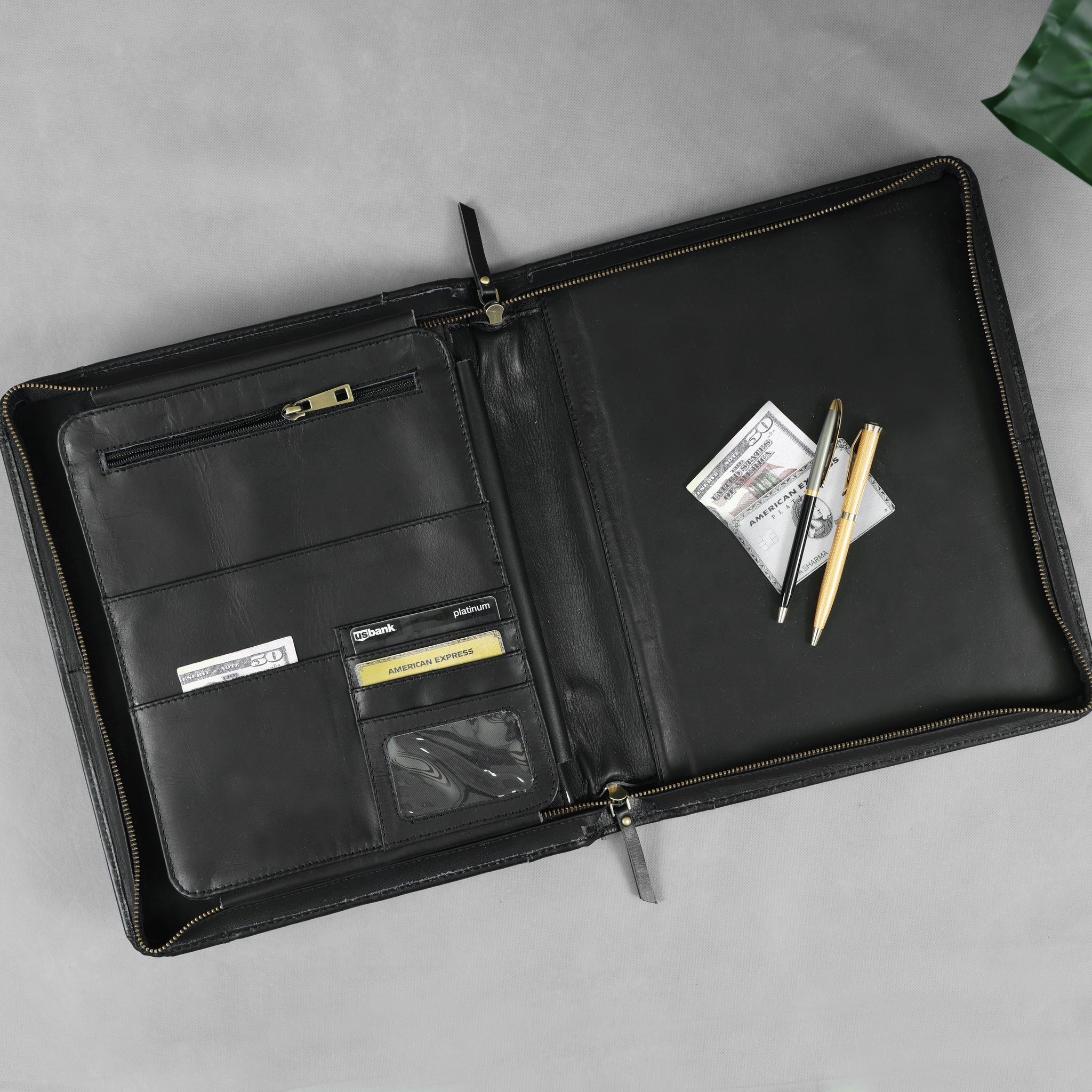 Handmade from high-quality full grain black leather, this zippered padfolio merges long-lasting strength with refined elegance. The secure zipper keeps your important documents safe, while its roomy interior features dedicated sections for notes and business cards. Ideal for professionals who appreciate both practicality and style, this padfolio helps you present yourself with confidence wherever your day takes you.