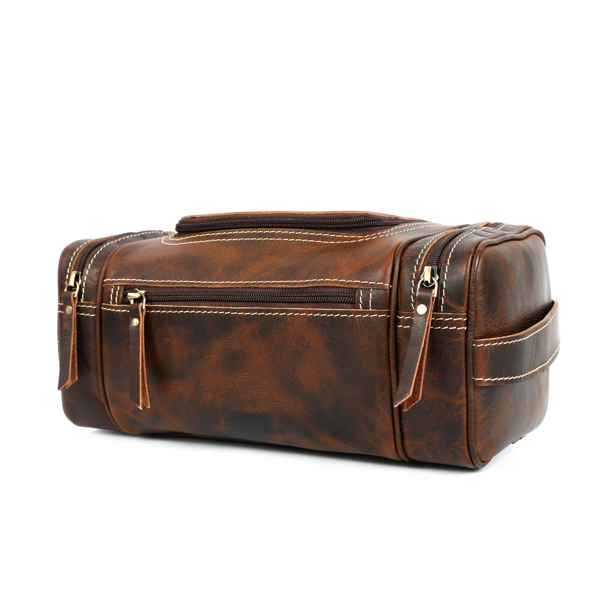 Handcrafted from rich water buffalo leather, this toiletry bag merges rugged durability with timeless appeal. Secure zipper closures safeguard your essentials while the attached hanger provides versatile hanging options for travel, home, or daily grooming needs. Authentic full grain leather develops distinctive character over time, ensuring your bag becomes more beautiful with use. A durable investment that rewards you with enhanced patina and charm through every journey.